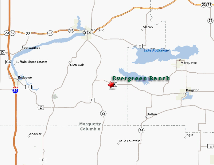 Evergreen Ranch is located south of Montello, north of Pardeeville, west of Kingston on County Highway B. It is exactly 1.8 miles east of State Highway 22 on County Road B.